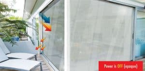When the power is off, the disordered polymer liquid crystal materials in the smart film makes the light unable to penetrate the film. In this case, the smart film is opaque milky white. When the power is on, the ordered polymer liquid crystal materials in the smart film makes the light able to penetrate the film. In this case, the smart film is colorless transparent.